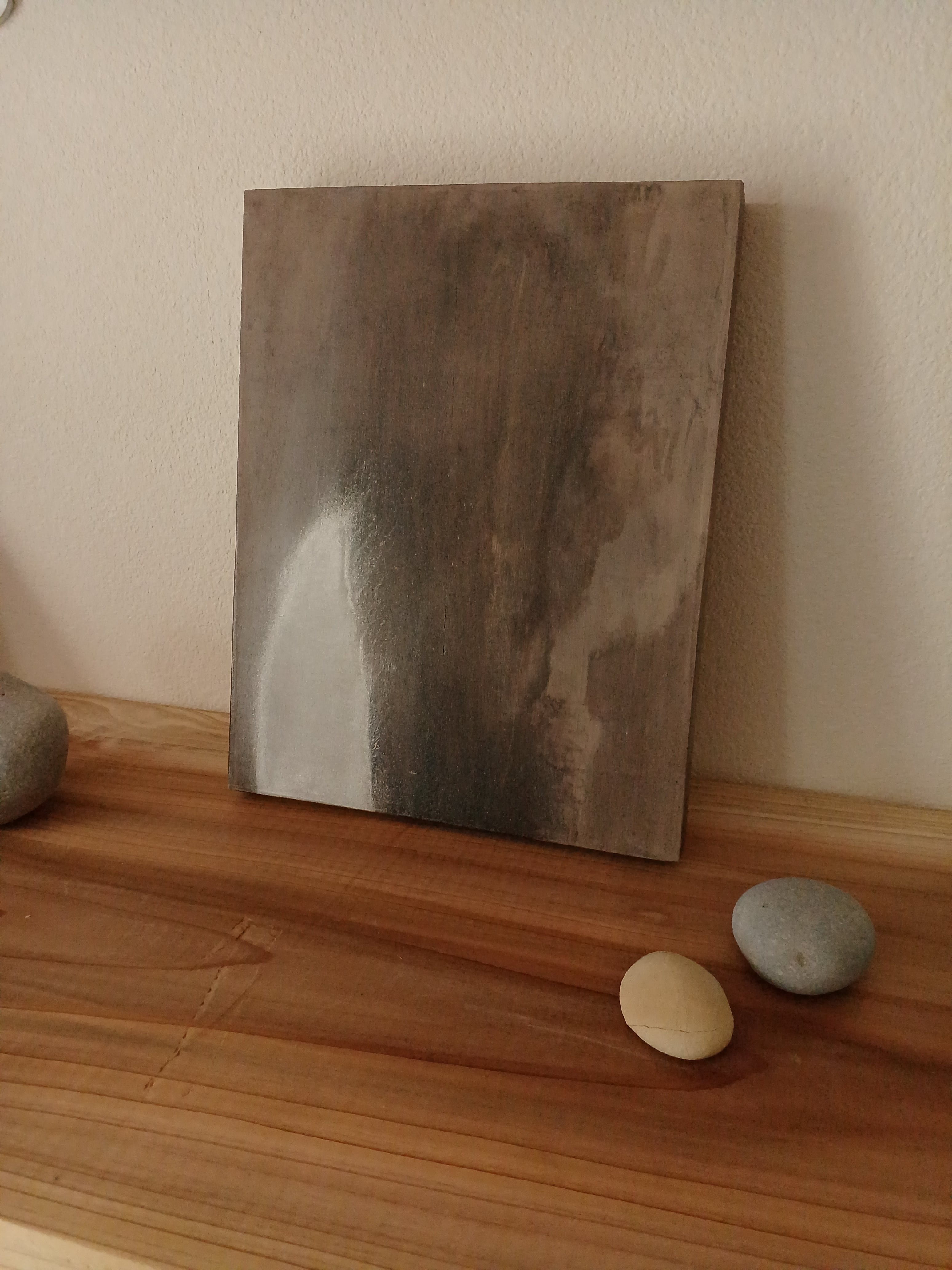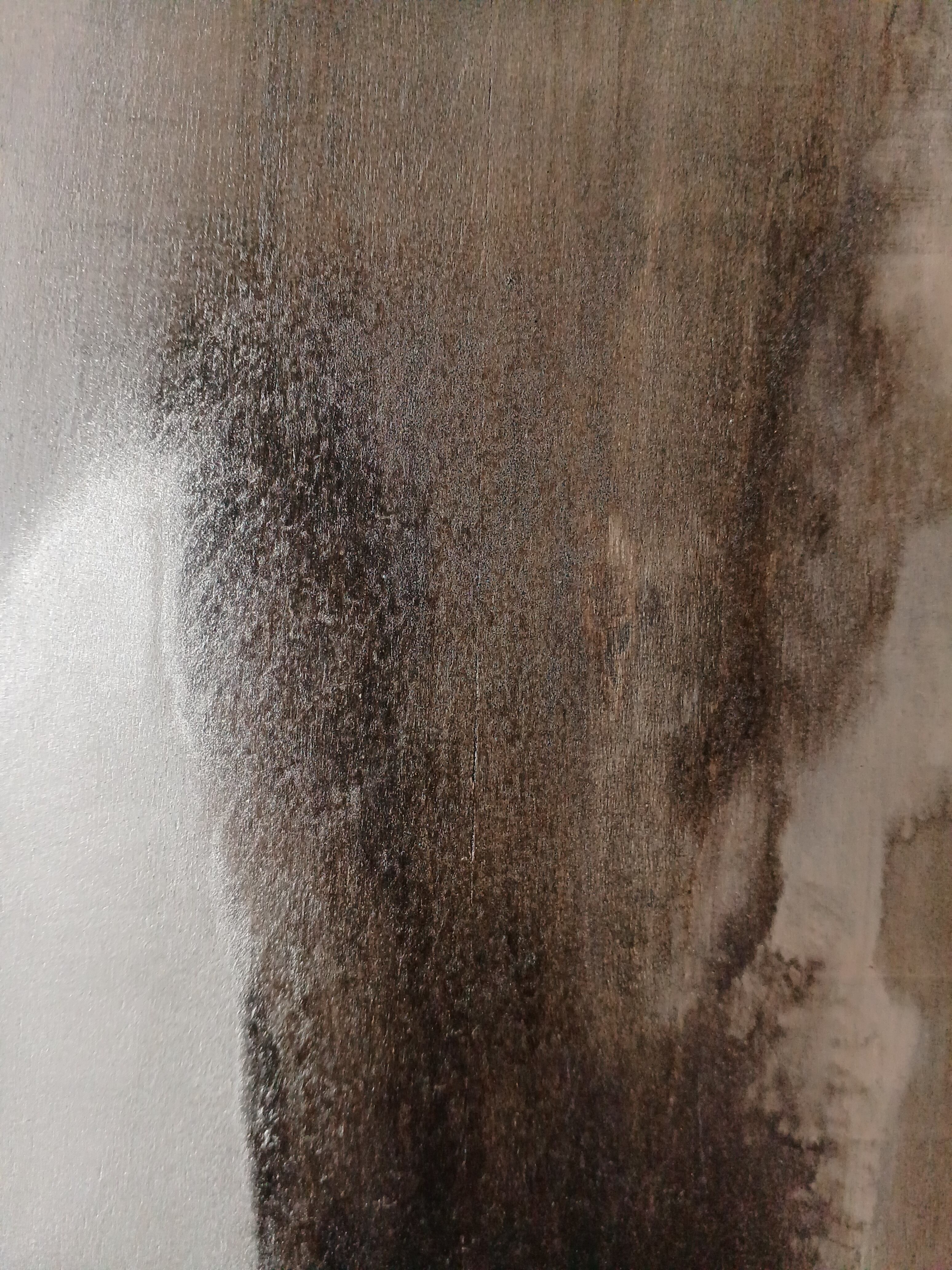 木製パネルに白と黒の漆を薄く塗り、アルミニウム粉を蒔いて描きました。